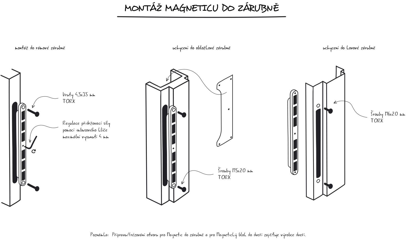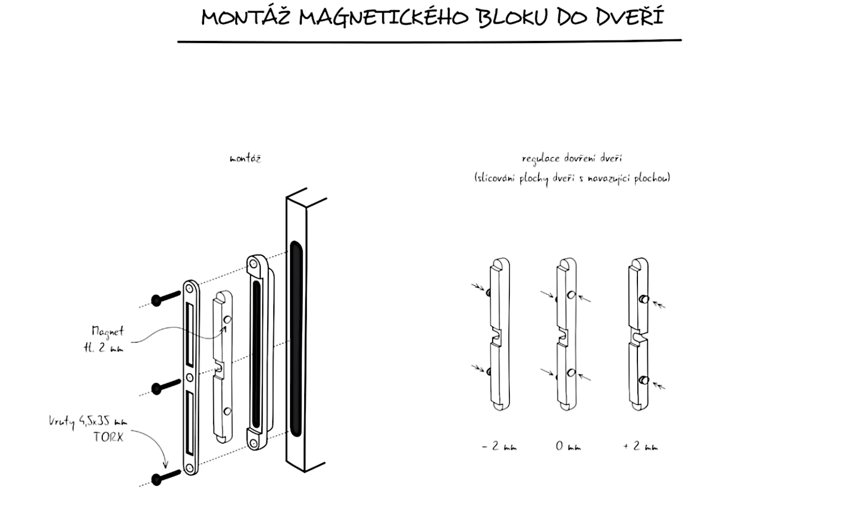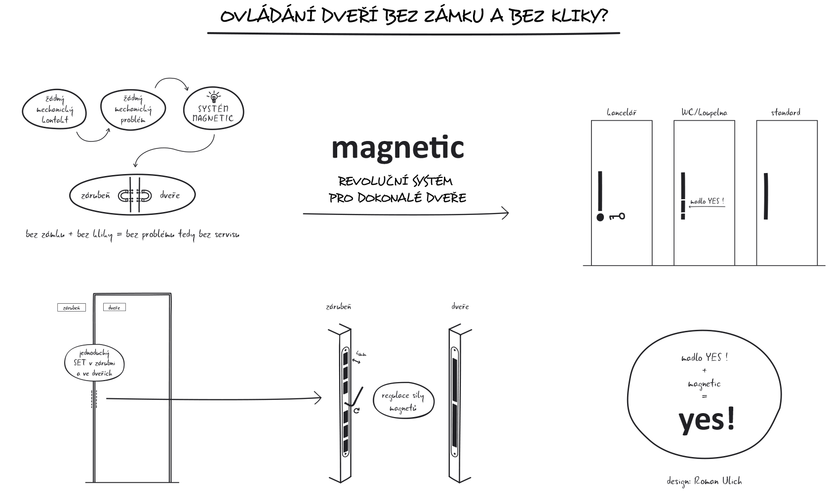 Připravili jsme inovativní systém ovládání dveří bez kliky, bez zámku, bez elektroniky. Do Magneticu jsme zapracovali řadu velmi silných magnetů a umístili je do dveřní zárubně, naproti do dveřního křídla jsme zasadili blok z magnetické nerez oceli. Při dovírání dveří se k sobě obě části přiblíží a působením magnetické síly zajistí plynulé dokonalé dovření. Magnetic dveře spolehlivě ovládá a uzavírá, ale nezamyká. Pro potřeby úplného uzamčení jsme připravili mini zámečky s variantou WC/koupelna a bezpečného uzamčení s cylindrickou vložkou. Systém je prioritně připraven pro otočné interiérové dveře, kde díky možnosti jednoduché jemné regulace síly magnetů při dovírání dveří poskytuje uživateli nečekanou přidanou hodnotu.